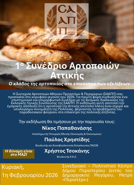 Η Συντεχνία Αρτοποιών Αθηνών Προαστίων & Περιχώρων (ΣΑΑΠΠ) διοργανώνει το 1ο Συνέδριο Αρτοποιών Αττικής,