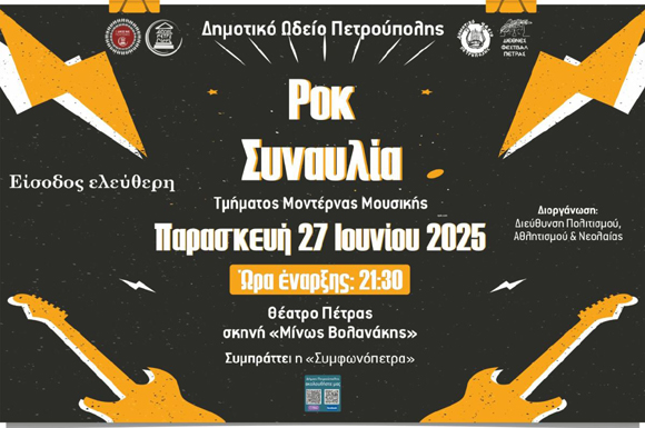 Σήμερα (20:30) η σκηνή «Μίνως Βολανάκης» θα φιλοξενήσει συναυλία κλασικής και παραδοσιακής μουσικής. Συμμετέχουν τμήματα Προπαιδείας - Προθεωρίας, Χορωδίες, και το Συγκρότημα Παραδοσιακής Μουσικής. Συμπράττει ομάδα εφήβων από το δημοτικό τμήμα Παραδοσιακών Χορών, υπό τη διδασκαλία της Κυριακής Λαγουδάκη, και η Χορωδία των Κ.Α.Π.Η. του Δήμου Πετρούπολης.