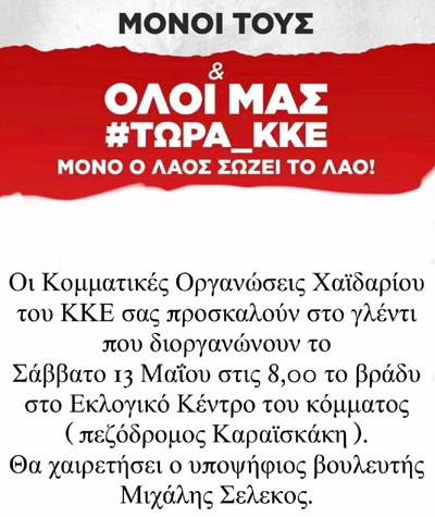 Οι Κομματικές Οργανώσεις Χαϊδαρίου του ΚΚΕ, το Σάββατο 13 Μαΐου στις 8,00 το βράδυ,