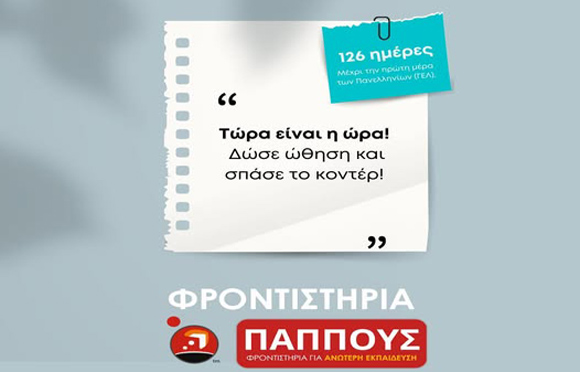 126 ημέρες μέχρι την πρώτη μέρα των Πανελληνίων (ΓΕΛ). Και αυτό σημαίνει ένα πράγμα: Τώρα είναι η ώρα! Στα Φροντιστήρια ΠΑΠΠΟΥΣ