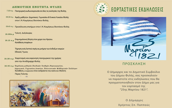 Πρόγραμμα εκδηλώσεων εορτασμού της Επετείου της 25ης Μαρτίου στο Δήμο Φυλής ΔΗΜΟΣ ΦΥΛΗΣ 23 Μαρτίου 2026