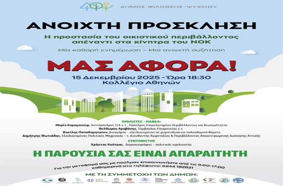 απέναντι στα κίνητρα του ΝΟΚ», η οποία θα πραγματοποιηθεί στο Κολλέγιο Αθηνών, τη Δευτέρα 15.12.2025 και ώρα 18.30. Η εκδήλωση πραγματοποιείται με την συμμετοχή των Δήμων: Αγίας Παρασκευής, Αλίμου, Βάρης – Βούλας – Βουλιαγμένης, Αμαρουσίου, Βριλησσίων, Ηρακλείου, Κηφισιάς, Νέας Ιωνίας, Νέας Φιλαδέλφειας – Νέας Χαλκηδόνας, Παπάγου – Χολαργού, Πεντέλης, Χαλανδρίου.