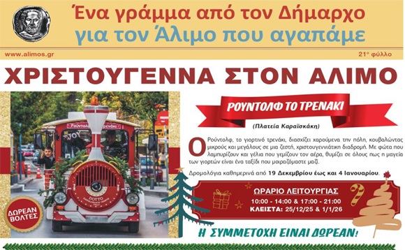 ΕΝΑ ΓΡΑΜΜΑ ΑΠΟ ΤΟΝ ΔΗΜΑΡΧΟ ΑΛΙΜΟΥ – ΤΕΥΧΟΣ ΑΦΙΕΡΩΜΕΝΟ ΣΤΑ ΠΑΙΔΙΑ ΔΗΜΟΣ ΑΛΙΜΟΥ 02 Δεκεμβρίου 2025 Για περισσότερα κάντε ΚΛΙΚ ΕΔΩ