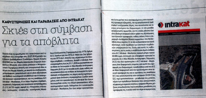 από ιστοσελίδα φίλα προσκείμενη στο ΣΥΡΙΖΑ (ΕΔΩ), αλλά και από την εταιρεία ΙΝΤΡΑΚΑΤ ΑΕ η οποία μέχρι χθες ήταν φιλική προς τις κρατικές και τις αυτοδιοικητικές αρχές της προηγούμενης κυβέρνησης.