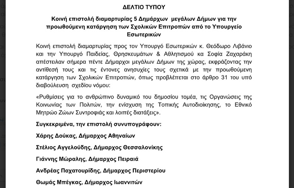Θρησκευμάτων & Αθλητισμού κα Σοφία Ζαχαράκη απέστειλαν σήμερα πέντε Δήμαρχοι μεγάλων Δήμων της χώρας, εκφράζοντας την αντίθεσή τους και τις έντονες ανησυχίες τους σχετικά με την προωθούμενη κατάργηση των Σχολικών Επιτροπών, όπως προβλέπεται στο άρθρο 31 του υπό διαβούλευση σχεδίου νόμου: