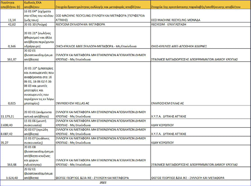 Πίνακας απολογισμού αποβλήτων στο Δήμο Κρωπίας για το 2022.