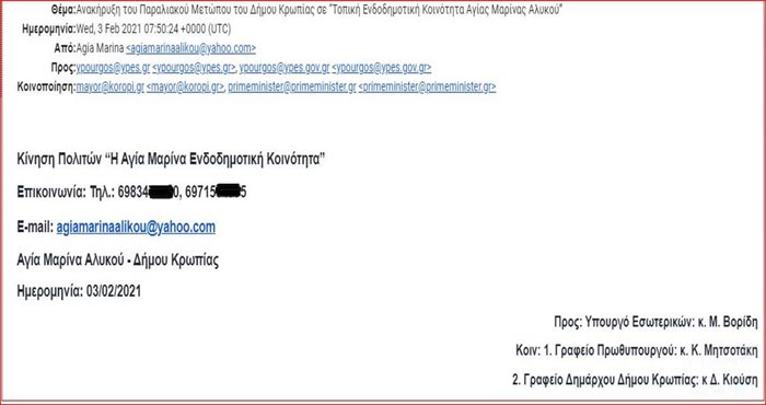 επιστολή της συντονιστικής επιτροπής ορισμένων κατοίκων της Αγίας Μαρίνας προς τον Υπουργό Εσωτερικών με κοινοποίηση προς τον Πρωθυπουργό και τον Δήμαρχο Κρωπίας (!) στις 3 Φεβρουαρίου 2021 (στο επίσημο e-mail του Δημάρχου Κρωπίας Αυτή η διεύθυνση ηλεκτρονικού ταχυδρομείου προστατεύεται από τους αυτοματισμούς αποστολέων ανεπιθύμητων μηνυμάτων. Χρειάζεται να ενεργοποιήσετε τη JavaScript για να μπορέσετε να τη δείτε. ). Η επιστολή της λεγόμενης συντονιστικής επιτροπής κατοίκων επιδίωκε απόσχιση της Αγίας Μαρίνας από το Δήμο Κρωπίας, προσάρτηση σε όμορο Δήμο και δημιουργία «νέου.. παραλιακού Δήμου»! Χαρακτηριστική είναι, μεταξύ άλλων, η τελευταία θλιβερή για την ιστορία της τοπικής αυτοδιοίκησης -και των εμπνευστών του σκληρού πυρήνα της συντονιστικής επιτροπής- παράγραφος της επιστολής, που εισάγει διαχωρισμούς μεταξύ κατοίκων του Δήμου μας με «διαφορετικά συμφέροντα» (ενδοχώρας - παραλιακού μετώπου!). Mάλιστα λένε ότι αυτά τα διαφορετικά συμφέροντα των κατοίκων (σ.σ ενδοχώρας) κρατάνε «πίσω» την ανάπτυξη του παραλιακού μετώπου! Είναι φανερό ότι αυτό θα πρέπει να προβληματίσει μέλη συλλόγων, απλό κόσμο της Αγίας Μαρίνας και των άλλων οικισμών ή πολίτες που υπέγραψαν χωρίς να γνωρίζουν πλήρως, εν μέσω πανδημίας, για τις σκοπιμότητες αυτής της κίνησης. Ενώ και το γεγονός των επαφών της συντονιστικής επιτροπής, πριν την αποστολή της επιστολής, με την μείζoνα αντιπολίτευση αλλά όχι με τη συμπολίτευση και το Δήμαρχο πρέπει να προστεθεί ολοκληρώνοντας μια εικόνα πλήρους αντιπολιτευτικής σκοπιμότητας και μόνο. Επίσης, δημοσιοποιούμε την επίσημη απόφαση του Δημοτικού Συμβουλίου Κορωπίου που απέρριψε την προσχηματική πρόταση της συντονιστικής επιτροπής για δημιουργία «τοπικής κοινότητας» στην Αγία Μαρίνα. ( https://diavgeia.gov.gr/doc/6%CE%92%CE%A9%CE%96%CE%A9%CE%9B6- 0%CE%973?inline=true ) Ο ενωτικός αγώνας όλων των δημοτικών συνδυασμών, όλων των κατοίκων και των συλλογικών φορέων για την επίλυση των ζητημάτων του Δήμου Κρωπίας είναι η μόνη ρεαλιστική διέξοδος.