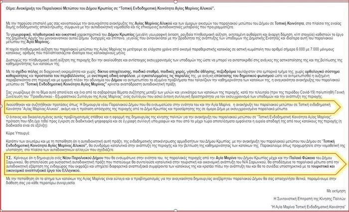 παραλιακού Δήμου όπου θα ενσωμάτωνε στην ενότητά του και την Αγ. Μαρίνα, ενώ «κρίνουν ότι