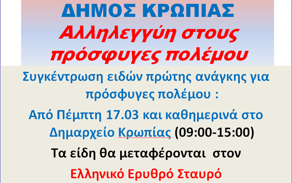 Από την Πέμπτη 17 Μαρτίου 2022, ο Δήμος Κρωπίας με επιμέλεια της Κοινωνικής Υπηρεσίας,