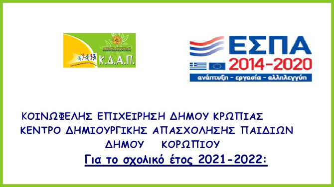 Οι εκπαιδευτικές δραστηριότητες του Κέντρου Δημιουργικής Απασχόλησης Παιδιών(ΚΔΑΠ) ηλικίας 5-12 ετών αποτελούν ΔΩΡΕΑΝ παροχή της