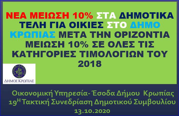 ΝΕΑ ΜΕΙΩΣΗ 10% ΣΤΑ ΔΗΜΟΤΙΚΑ ΤΕΛΗ ΓΙΑ ΟΙΚΙΕΣ ΣΤΟ ΔΗΜΟ ΚΡΩΠΙΑΣ ΜΕΤΑ ΤΗΝ ΟΡΙΖΟΝΤΙΑ ΜΕΙΩΣΗ 10% ΣΕ ΟΛΕΣ ΤΙΣ