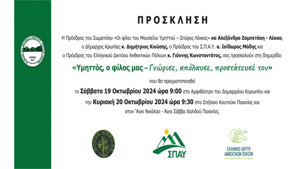 «Υμηττός, ο φίλος μας – Γνώρισε, απόλαυσε και προστάτευσέ τον» Αμφιθέατρο Δημαρχείου Κορωπίου - 19 & 20 Οκτωβρίου 2024