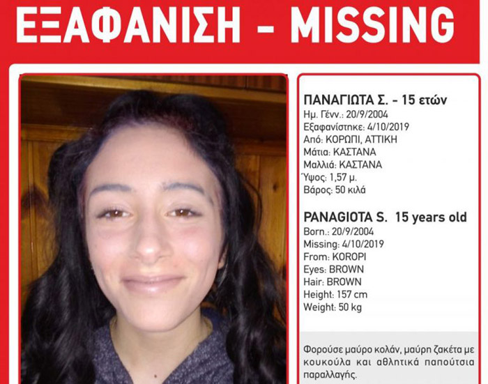 Συναγερμός έχει σημάνει στις Αρχές για την εξαφάνιση της 15χρονης Παναγιώτας Σ. από την περιοχή του Κορωπίου.