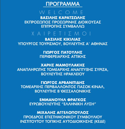 Η εκδήλωση θα ανοίξει με την τοποθέτηση του προσωρινού Προέδρου του δικτύου “ΣΥΜΒΑΛΛΩ” Βασίλη Καρατσώλη, ενώ θα χαιρετίσουν εκπρόσωποι του πολιτικού κόσμου και της τοπικής αυτοδοίκησης. Ο Βασίλης Κικίλιας, Υπουργός Τουρισμού και βουλευτής Ά Αθήνας από την Νέα Δημοκρατία, ο Γιάννης Σαρακιώτης Αναπληρωτής Τομεάρχης Ανάπτυξης και βουλευτής Φθιώτιδας του ΣΥΡΙΖΑ, ο Γιώργος Αρβανιτίδης τομεάρχης Περιβάλλοντος και βουλευτής Β’Θεσσαλονίκης από ΠΑΣΟΚ-ΚΙΝΑΛ, ο Εμμανουήλ Φράγκος Ευρωβουλευτής “ΕΛΛΗΝΙΚΗ ΛΥΣΗ”. Χαιρετισμό θα απευθύνει επίσης ο Περιφερειάρχης Αττικής Γιώργος Πατούλης και ο Πρόεδρος του Επιστημονικού Συμβουλίου του Ινστιτούτου Τοπικής Αυτοδιοίκησης της ΚΕΔΕ Μιχάλης Αγγελόπουλος.