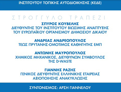 Η εκδήλωση θα αποτέλεσει αφορμή για μια ευρεία δημόσια συζήτηση σε στρογγυλό τραπέζι και στο πλαίσιο αυτό θα συμετάσχουν οι Σπύρος Κουβέλης, Διευθυντής του Ινστιτούτου Βιώσιμης Ανάπτυξης του Ευρωπαϊκού Οργανισμού Δημοσίου Δικαίου, Ανδρέας Ανδριανόπουλος, Τέως Πρύτανης Ε.Μ.Π., Αντώνης Μαυρόπουλος Χημικός Μηχανικός, Γιάννης Ραζής Γενικός Διευθυντής Ελληνικής Εταιρείας Αξιοποίησης Ανακύκλωσης.