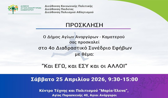 Σας ενημερώνουμε ότι το Σάββατο 25 Απριλίου 2026 από τις 09.30-15.00 στο Κέντρο Τέχνης και Πολιτισμού «Μαρία- Ελενα» θα πραγματοποιηθεί το 4ο Διαδραστικό Συνέδριο Εφήβων με τη συμμετοχή ψυχολόγων, εκπαιδευτικών, κοινωνιολόγων, μαθητών. Στο συνέδριο θα επισημανθούν τα προειδοποιητικά σημάδια για την αναγνώριση της βίας, θα παρουσιαστούν βίντεο και βιωματικά δρώμενα, ενώ θα αναλυθούν και οι δυσκολίες των διαφυλικών σχέσεων και οι προκλήσεις.