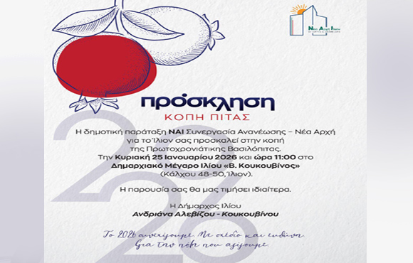 ΠΡΟΣΚΛΗΣΗ: Η δημοτική παράταξη ΝΑΙ Συνεργασία Ανανέωσης - Νέα αρχή για το Ίλιον σας προσκαλεί στην κοπή της Πρωτοχρονιάτικης Βασιλόπιτας.