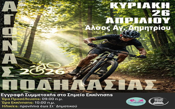 Την Κυριακή 26 Απριλίου, το άλσος Αγίου Δημητρίου θα γεμίσει με παιδικά χαμόγελα, ενέργεια και αγωνιστικό πνεύμα, φιλοξενώντας μικρούς ποδηλάτες από προνήπια έως και μαθητές της ΣΤ' Δημοτικού. Η ώρα προσέλευσης έχει οριστεί στις 9:00 π.μ., ενώ η εκκίνηση του αγώνα θα δοθεί στις 10:00 π.μ.