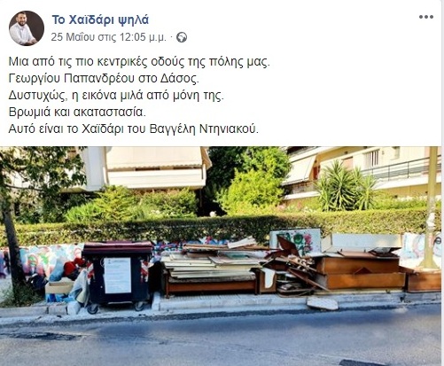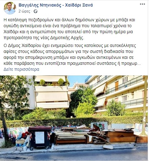 Ο λόγος για την φωτογραφία από την σελίδα της παράταξης μας, στο επίσημο δελτίο τύπου του δήμου Χαϊδαρίου για τα ογκώδη αντικείμενα στα πεζοδρόμια.
