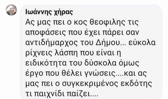 Υ.Γ. 6 Δεν φοβήθηκα ποτέ την πολιτική κριτική αλλά έμαθα να επιστρέφω τη λάσπη. Απαντώ στον εργαζόμενο, ότι κατά τη θητεία μου ως Αντιδήμαρχος, εργάστηκα αμισθί και δεν τακτοποίησα σε θέσεις εργασίας του δήμου, κολλητούς κι ημετέρους. Εν αντιθέσει , με την παράταξη-κληρονομιά του σημερινού δημάρχου.