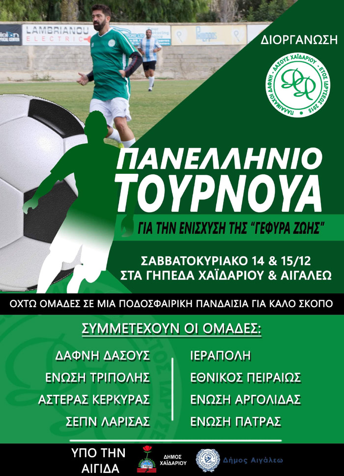 και Αιγάλεω θα πραγματοποιηθεί το Σαββατοκύριακο 14 και 15 Δεκεμβρίου. Σκοπός της διοργάνωσης είναι η ενίσχυση του σωματείου «ΓΕΦΥΡΑ ΖΩΗΣ». Στο τουρνουά θα συμμετάσχουν ομάδες από την Κέρκυρα, την Πάτρα, την Λάρισα, την Τρίπολη, την Αργολίδα καθώς και ο Εθνικός Πειραιά και η Ιεράπολη Αιγάλεω. Οι αγώνες της Α’ φάσης θα διεξαχθούν στα γήπεδα «Τάκης Χαραλαμπίδης», και ΔΑΚ Αιγάλεω. Ο μεγάλος και ο μικρός τελικός θα γίνουν στο γήπεδο «Σταύρος Μαυροθαλασσίτης».