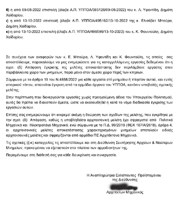 Υ.Γ 1- Επειδή το ψάξαμε λίγο, μάθαμε ότι η συγκεκριμένη Αρχιτέκτων Μηχανικός του Υπουργείου που υπογράφει την επιστολή, είναι ιδιαίτερα σχολαστική και αυστηρή για παρόμοιες υποθέσεις ενώ δεν έχει διστάσει κάποιες από αυτές, να τις στείλει στον αρμόδιο Εισαγγελέα.