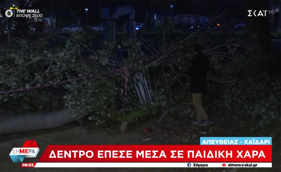 Ένα πανύψηλο δέντρο ξεριζώθηκε κι έπεσε με όλο το βάρος του πάνω σε παιδική χαρά στο Χαϊδάρι.