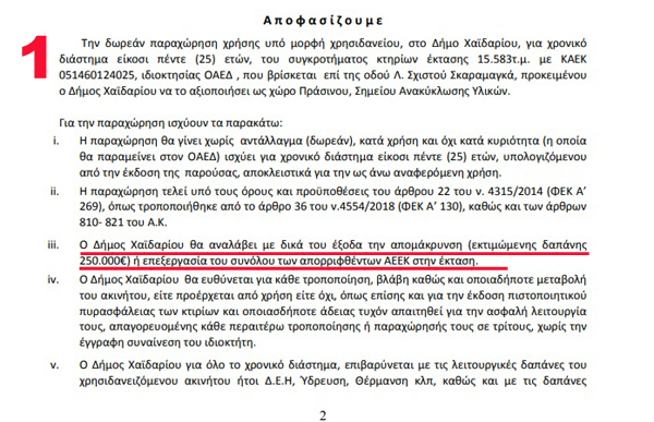 Το περίεργο είναι ότι, στο έγγραφο παραχώρησης του Υπουργείου Εργασίας και Κοινωνικών Υποθέσεων, στην τρίτη παράγραφο της απόφασης γράφει καθαρά (φωτό 1): «Ο Δήμος Χαϊδαρίου θα αναλάβει με δικά του έξοδα την απομάκρυνση (εκτιμώμενης δαπάνης 250.000€) ή επεξεργασία του συνόλου των απορριφθέντων ΑΕΕΚ στην έκταση», ενώ ο Δήμαρχος Χαϊδαρίου Βαγγέλης Ντηνιακός (φωτό2) στη 13η συνεδρίαση του Δημοτικού Συμβουλίου είπε, ότι το κόστος για την απομάκρυνση των μπαζών ανέρχεται περίπου στα 2 εκατομμύρια ευρώ και απαιτούνται 1.200 δρομολόγια φορτηγών (από χρυσάφι να ήταν τα μπαζοσκούπιδα, πιο λίγο θα στοίχιζαν). Δηλαδή, 8 φορές πάνω από την εκτίμηση του Υπουργείου.