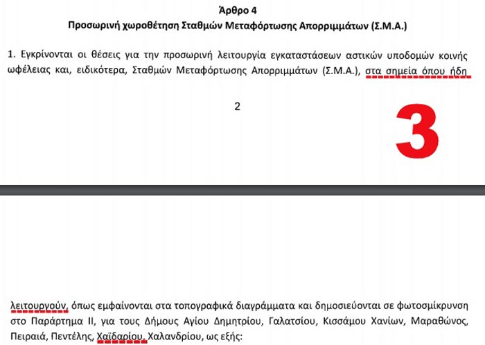 Τα πράγματα είναι απλά και καθαρά, διότι με την συγκεκριμένη τροπολογία αλλά και σύμφωνα με το δελτίο τύπου του Υπουργείου Περιβάλλοντος, «εγκρίνονται οι θέσεις για την προσωρινή λειτουργία εγκαταστάσεων ΣΜΑ, στα σημεία όπου ήδη λειτουργούν» κάτι που αναγράφεται ρητά και κατηγορηματικά στην αρχή του άρθρου (ΦΩΤΟ 3). Δεν γράφει πουθενά για κατασκευή νέου ΣΜΑ, αλλά, για ΣΜΑ όπου ήδη λειτουργούν οι Δήμοι και εδώ είναι το σκάνδαλο όσων αφορά τον Δήμο Χαϊδαρίου.