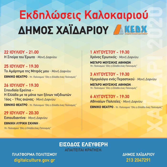 Καλοκαιρινές εκδηλώσεις του Δήμου Χαϊδαρίου στη Μονή Δαφνίου από 22 Ιουλίου έως 6 Αυγούστου 2020