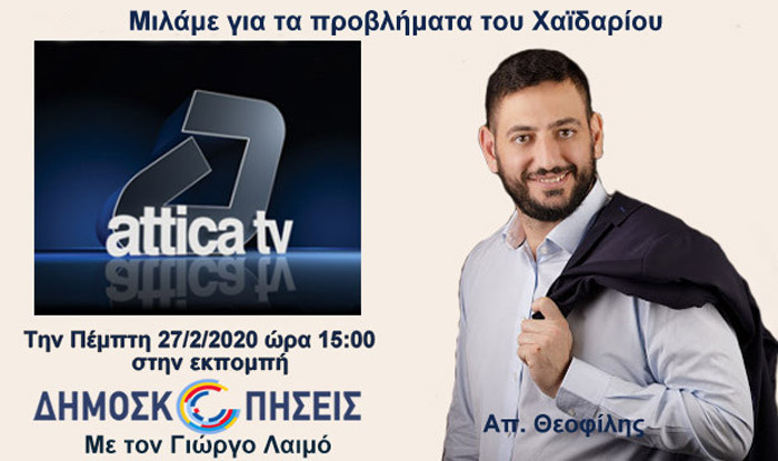 Στην εκπομπή «ΔΗΜΟΣΚΟΠΗΣΕΙΣ» στο «attica tv» με παρουσιαστή τον Γιώργο Λαιμό φιλοξενήθηκε ο επικεφαλής της παράταξης «Το Χαϊδάρι Ψηλά» , Αποστολής Θεοφίλης