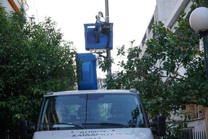 Συνεργεία του Δήμου Χαϊδαρίου με καλαθοφόρο όχημα πραγματοποιούν αυτές τις ημέρες αντικαταστάσεις καμένων λαμπτήρων σε όλο το δίκτυο