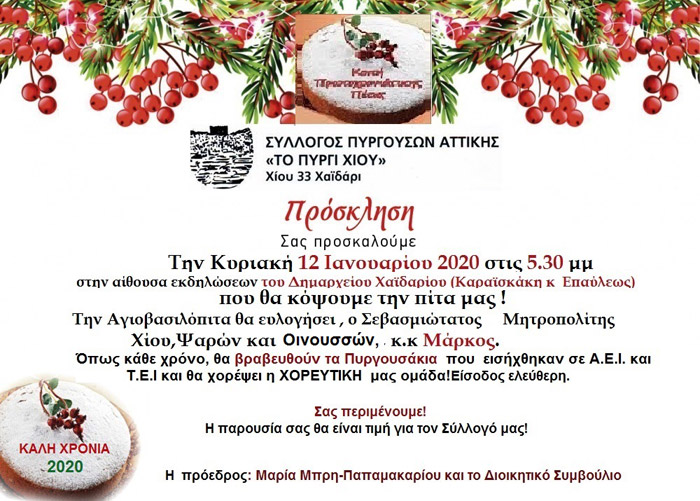 Με ιδιαίτερη χαρά, σας προσκαλούμε όλους,να τιμήσετε με την παρουσία σας την κοπή της Πρωτοχρονιάτικης πίτας του Συλλόγου μας,