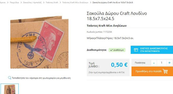 Σε άλλο ένα σκάνδαλο πρωταγωνιστεί η εταιρεία του mr. Jumbo. Πωλούσε σακούλες δώρου με τα ναζιστικά σύμβολα και την προσωπογραφία του Χίτλερ,