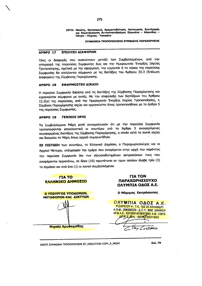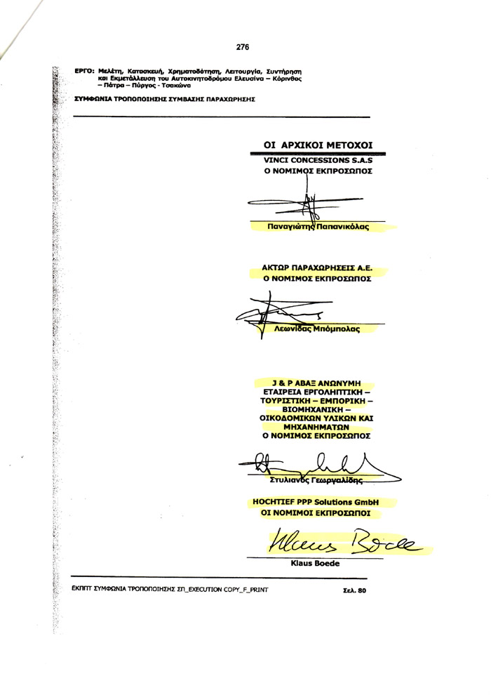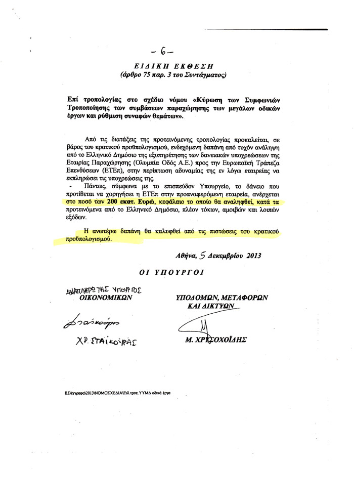 Έφτασαν μάλιστα στο σημείο (Χρυσοχοΐδης – Σταϊκούρας) επί συγκυβέρνησης ΝΔ-ΠΑΣΟΚ, τον Δεκέμβριο του 2013 να περάσουν τροπολογία με… εγγύηση του ελληνικού δημοσίου για να δανειστούν οι εργολάβοι 200 εκατ. ευρώ από την Ευρωπαϊκή Τράπεζα Επενδύσεων! (εικόνα 1). Στην Κοινοπραξία «Ολυμπία Οδός» όπως και σε άλλες κοινοπραξίες, μετέχει και η… «τεράστια» Hochtief ΑΕ αυτή τη φορά ως ΕΠΕ ! (Εικόνες α και β με τις υπογραφές). Για όποιον δεν θυμάται, η Hochtief είναι αυτή που στην κατασκευή του «Ελ. Βενιζέλος» δεν πλήρωσε ποτέ στο ΙΚΑ τα ένσημα των εργαζομένων ύψους 500 εκατ. ευρώ…