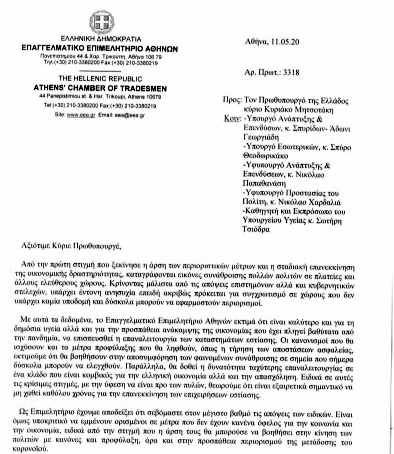 Η παρέμβαση του Προέδρου του Επαγγελματικού Επιμελητηρίου Αθηνών κ. Γ. Χατζηθεοδοσίου προς τον Πρωθυπουργό, για την ταχύτερη επαναλειτουργία