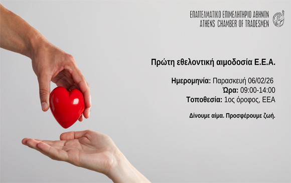 διοργανώνοντας για πρώτη φορά εθελοντική αιμοδοσία, μια δράση υψηλού συμβολισμού και πραγματικής προσφοράς προς τον συνάνθρωπο. Η αιμοδοσία θα πραγματοποιηθεί την Παρασκευή 6 Φεβρουαρίου 2026, από 09:00 έως 14:00, στον 1ο όροφο του Επαγγελματικού Επιμελητηρίου Αθηνών. Καλούνται τα μέλη – μικρομεσαίοι επιχειρηματίες & επαγγελματίες, οι συνεργάτες και οι εργαζόμενοι να αφιερώσουν λίγα λεπτά από τον χρόνο τους και να συμβάλουν σε αυτή τη συλλογική προσπάθεια ζωής. Για την καλύτερη οργάνωση της δράσης, υπάρχει Φόρμα Εκδήλωσης Ενδιαφέροντος, μέσω της οποίας μπορείτε να δηλώσετε τη συμμετοχή σας πατώντας ΕΔΩ. Η αιμοδοσία αποτελεί μια απλή, ασφαλή και ανεκτίμητη πράξη που μπορεί να σώσει ζωές και να χαρίσει ελπίδα σε ανθρώπους που το έχουν πραγματικά ανάγκη. Δίνουμε αίμα. Προσφέρουμε ζωή.