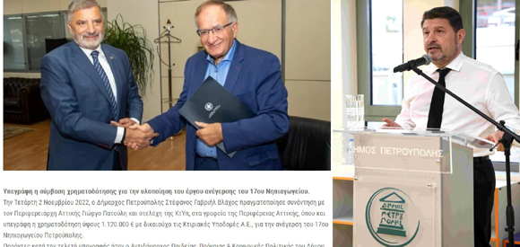 Για την επένδυση των πάνω από τα 100 εκατ. ευρώ δεν γνωρίζουμε, δεν σχολιάζουμε και δεν εκφέρουμε κάποια άποψη. Όμως,  (παρακαλούμε διορθώστε μας αν κάνουμε λάθος) το συγκεκριμένο νηπιαγωγείο (όπως και πολλά άλλα έργα στην Αττική), έχει υπογραφεί και ενταχθεί επί Περιφερειάρχη Αττικής, Γιώργου Πατούλη, την Τετάρτη 22/11/2022 (ΦΩΤΟ). Πως γίνεται λοιπόν, το 17ο νηπιαγωγείο Πετρούπολης να αποτελεί τμήμα της δομημένης στρατηγικής του, όπως δηλώνει ο κύριος Περιφερειάρχης; Εκτός βέβαια αν εννοεί, ότι ακολουθεί το πρόγραμμα Πατούλη και το έχει εντάξει στο δικό του, οπότε εκεί το μόνο που μπορούμε να κάνουμε, είναι να «απονείμουμε τα εύσημα» και να πούμε μπράβο στον Περιφερειάρχη μας! Άξιος συνεχιστής στο έργο του προκατόχου του.
