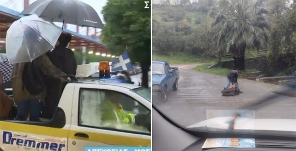 του Δημοτικού σχολείου Κροκεών ανάγκασε τους δασκάλους να ειδοποιήσουν του γονείς να πάρουν τα παιδιά.. Στο ψιλόβροχο που ξεκίνησε χθες ... αποδίδουν τα φερέφωνα της τοπικής διοίκησης το συμβάν!!! Σύμφωνα με τους κατοίκους δεν χρησιμοποιήθηκε αγροτικό με καρότσα για την μεταφορά των μαθητών τύπου Μοσχάτο (φωτ) αλλά τα ΙΧ αυτοκίνητα των γονέων. Στην δεύτερη φωτογραφία βλέπουμε πολίτη να κάνει τις δουλειές τoυ Δήμου καθαρίζοντας δημοτικό δρόμο στην Πίσω Βρύση Κροκεών από φερτά υλικά την ώρα που ο τοπικός Πρόεδρος της κοινότητας βγάζει φωτογραφίες... για να λανσάρει την παπάτζα των ακραίων καιρικών φαινομένων !!!