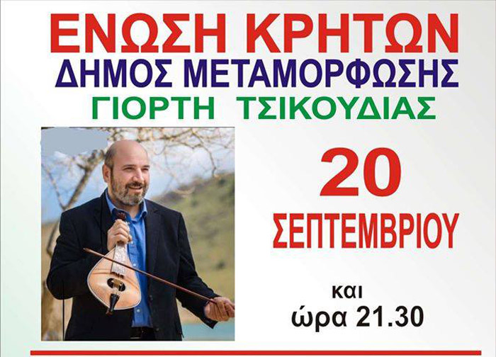 Η Ένωση Κρητών Μεταμόρφωσης έχει τη μεγάλη χαρά να σας προσκαλέσει στη Γιορτή Τσικουδιάς που διοργανώνει, την Παρασκευή 20 Σεπτεμβρίου και ώρα 21:30 με το